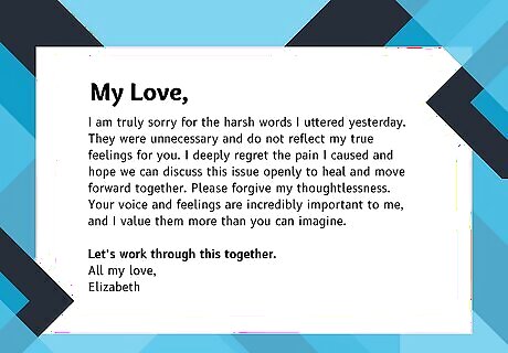 Heart-Touching My Love,I am truly sorry for the harsh words I uttered yesterday. They were unnecessary and do not reflect my true feelings for you. I deeply regret the pain I caused and hope we can discuss this issue openly to heal and move forward together. Please forgive my thoughtlessness. Your voice and feelings are incredibly important to me, and I value them more than you can imagine. Let’s work through this together.All my love,[Name] Meet the wikiHow Experts Kelli Miller, LCSW, MSW, is a relationship counselor and psychotherapist specializing in individual and couples therapy. Gera Anderson, PsyD, is a licensed clinical psychologist specializing in integrated behavioral health, neuropsychological assessment, and pain management. Supatra Tovar, PsyD, RD, is a licensed clinical psychologist with over 25 years of practice in holistic health psychotherapy. Lena Dicken, Psy.D, is a clinical psychologist specializing in therapy for anxiety, depression, life transitions, and relationship difficulties.