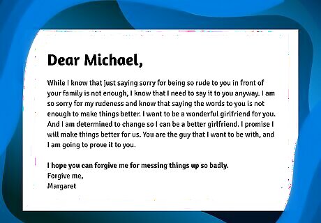 Ask for their forgiveness. One of the most important parts of a genuine apology letter to your boyfriend is asking them to forgive you. It’s ultimately up to him to decide when and how he can forgive you; he may need time and space to think things over. Miller trusts that you should "be patient and understand that whatever happened may have broken this person's trust. It may take a little time for them to come back around." I value our relationship and will do everything I can to earn your forgiveness. I messed up, and I'm truly sorry. You didn't deserve that, and I feel terrible for hurting you. I'm deeply sorry for my behavior. I was out of line, and I regret my actions. Please forgive me.