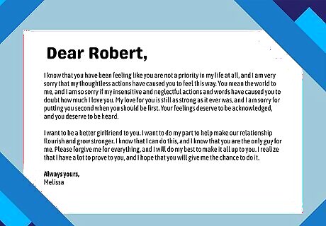 Express a genuine commitment to change and make things right. Miller suggests “apologizing, but then follow up with actions, whether that be showing that they can trust you again, or that you're willing to make more effort." When trying to make up with your boyfriend after hurting him, show specific ways you intend to work on aspects of yourself you don’t like and restate how much he deserves better. Here are some examples of committing to change: I’m committed to making it up to you. Please let me make you dinner tomorrow night. I've thought about what I can do to show you I'm sorry. Can we talk about what would help you feel better? I'm willing to [behavior or actions to make things better], if that would help. Please let me try. EXPERT TIP Lena Dicken, Psy.D Lena Dicken, Psy.D Clinical Psychologist Dr. Lena Dicken is a Clinical Psychologist based in Santa Monica, California. With over eight years of experience, Dr. Dicken specializes in therapy for anxiety, depression, life transitions, and relationship difficulties. She utilizes an integrative approach combining Psychodynamic, Cognitive Behavioral, and Mindfulness-based therapies. Dr. Dicken holds a BS in Integrative Medicine from the University of Hawaii at Manoa, an MA in Counseling Psychology from Argosy University Los Angeles, and a Doctor of Psychology (Psy.D) in Clinical Psychology from the Chicago School of Professional Psychology at Westwood. Dr. Dicken’s work has been featured in GOOP, The Chalkboard Magazine, and in numerous other articles and podcasts. She is a licensed psychologist with the state of California. Lena Dicken, Psy.D Lena Dicken, Psy.D Clinical Psychologist Give them space after apologizing. Try saying, “‘I understand that you're still upset with me, and that I've hurt you deeply. I want our relationship to continue, and when you are ready to talk, I'm ready to listen.