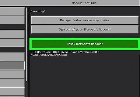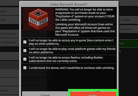 Choose Unlink Microsoft Account. This will open a pop-up with some warnings about unlinking your Microsoft account. If you unlink your Microsoft account, any progress or purchases made in Minecraft on your console won't be stored on your Microsoft account.