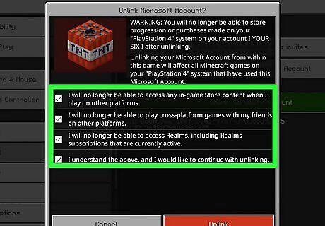 Check the boxes. There are four boxes you must check. To check them, scroll over them and press X. The checkboxes ask you to confirm that you understand that you won't be able to access in-game store content when you play on other platforms, that you won't be able to play cross-platform games with friends on other platforms, and that you won't be able to access any Realms after unlinking your Microsoft account.