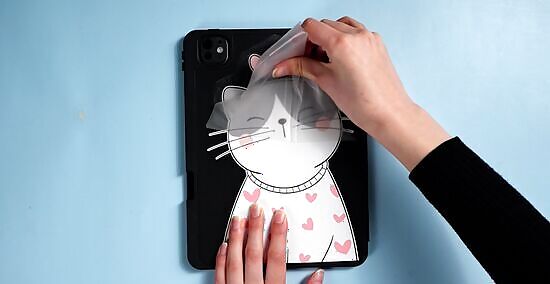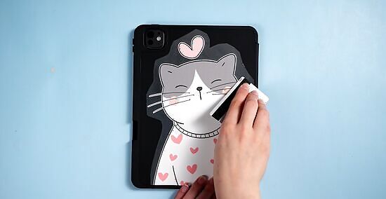 Apply the right side of the decal, then repeat on the left side. Starting from the center, roll the sticker back into place, pressing it firmly into place with your hands. Then, use a squeegee to smooth out any air bubbles. Remove the tape hinge, then fold over the left side of the sticker and pull away any remaining backing. Carefully apply the left side of the sticker to the surface, pressing down firmly as you go, then finish smoothing out any air bubbles.