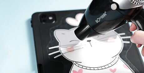 Heat curved vinyl stickers with a blow dryer to make them stick. Don’t be discouraged if your sticker isn’t adhering properly to a curved edge or surface, like a car bumper. Turn a hairdryer or heat gun to a low setting, and run the device several inches or centimeters above the surface of the sticker. Then, use your squeegee to help smooth the sticker until it lays against the curved edge. Don’t use a high heat setting for this—you’re only looking to stretch and expand the vinyl, not melt it.