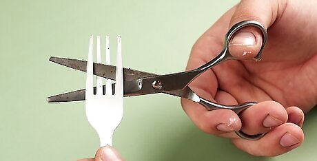 Break off the 2 middle tines of the fork. Use your fingers to gently bend the two middle tines, or prongs, of a white plastic fork, until they snap at the base. Tines are the points or “teeth” of the fork that allow you to pierce food. Alternatively, remove the tines by cutting them off with sharp scissors or a utility knife.