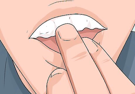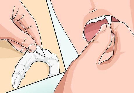 Slip the acrylic fangs over your canines. Since each fang is custom-fit to your teeth, you can simply press them in place with your fingers, while slightly sucking in your mouth. If the fangs do not stay in place on their own, however, hold them in place using denture glue, braces wax, or a small dot of gum.