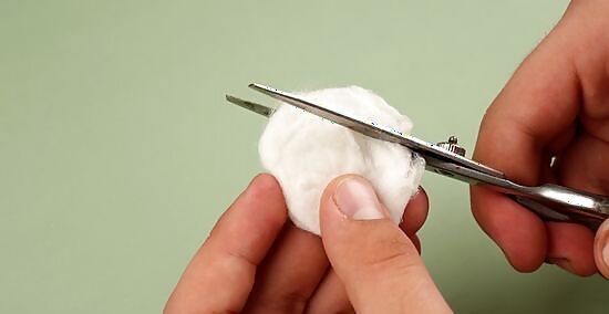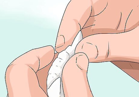 Make vampire fangs from cotton balls. Wet a cotton ball, then use scissors to trim it into 2 fang-like triangles. Hold the triangles over your teeth to see if you need to trim off any excess, and cut them until you achieve your desired shape. When you’re ready to attach the cotton, dry your tooth and gum area, then stick them over your canines for instant fangs. When the cotton is damp, it should stick to your teeth without any glue, giving you enough time to snap a quick photo. If you plan to wear your fangs for longer, apply a thin coating of denture adhesive powder over the back of the fang, then press it over your tooth—the moisture from the cotton activates the adhesive and makes it sticky.