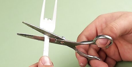 Cut off the handle and the top part of the fork. Using sharp scissors, trim the fork halfway between the handle and the base of the tines, right at the spot where the fork begins to curve. Remove the piece in a straight horizontal line, or go back with a utility knife to clean up the edges. The remaining piece should be fairly boxy rather than being rounded.