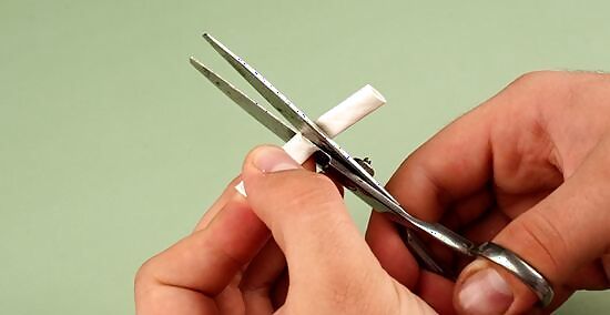 Cut off a small piece of the straw. Use a pair of scissors to cut off a piece of straw that’s about 2 inches (5 cm) long—this will serve as both fangs. If your straw is a bendy, you can simply cut off the top portion, right above the accordion bend.
