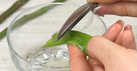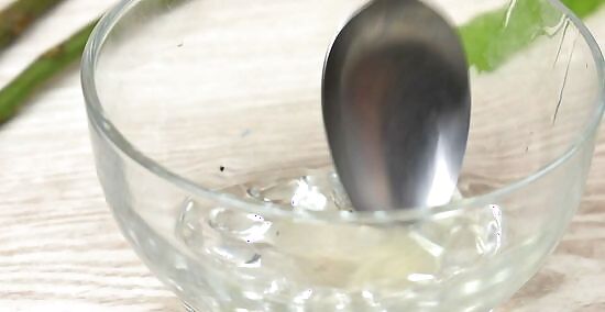 Mash the gel in a cup until it has a watery consistency. First, scoop the gel from the aloe leaf into a small cup and stir it with your spoon to break apart the larger chunks. Use the back of your spoon to smash the gel to loosen its consistency so it’s runnier. Once the gel easily moves around and flows like water, you can use it for your hormone. Add 1 tablespoon (15 mL) of water to your aloe gel if the texture doesn’t become runnier after mashing it around.