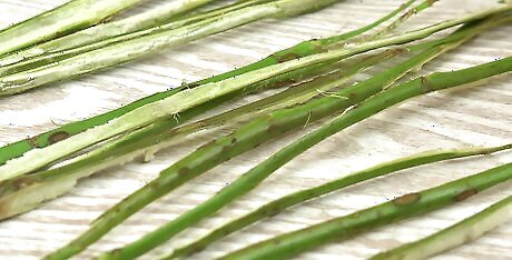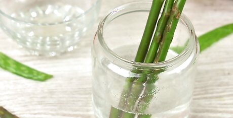Push the gel out from an aloe vera leaf using a spoon. Cut a healthy leaf off an aloe plant with a clean, sharp knife. Lay the leaf flat on a cutting board in front of you so the pointed end faces you. Press the back of a spoon on the point of the leaf and apply firm pressure as you guide the spoon toward the cut end. The gel from inside the leaf will push out of the cut end onto your cutting board. The aloe gel protects the cutting from bacteria and fungi in the soil. Alternatively, use 100% pure organic aloe gel from the store as long as it doesn't have any other added ingredients.