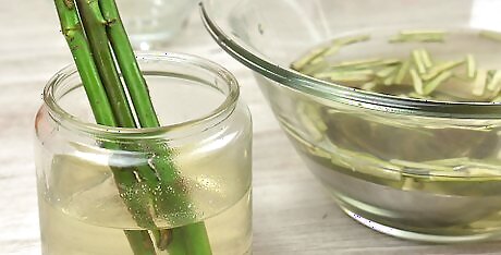 Soak your cuttings in the willow solution for 2-3 hours before planting. When you’re ready to plant your cuttings, dip the cut ends in the willow water solution and leave them to soak for at least 2 hours so they can absorb the nutrients. After they’ve soaked, put your cuttings in a rooting medium so they can start to grow. To get more use out of your homemade hormone and encourage growth, use the willow solution to water your cuttings during the first month for healthy roots and foliage. It’s safe to leave your cuttings in the willow water for up to 48 hours (they may even begin to show root growth in the solution).
