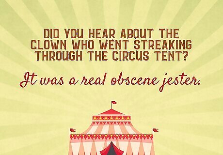 Crack up adults with a darker joke about clowns. Some people think clowns are evil and scary, so expand on that fear with a dark or naughty joke. Here are some mature options to give people the creeps: What do you get when you boil a clown? Laughing stock. Why don’t cannibals eat clowns? Because they taste funny. Why arn't you allowed to incinerate clowns? They burn funny. What's better than a clown falling out of a window? Another one below him. How do you kill a clown who has big floppy shoes? With a big floppy sack of door knobs. What’s the difference between jelly and jam? You can’t jelly a clown into the tiny automobile. Did you hear about the clown who went streaking through the circus tent? It was a real obscene jester. If a car with four clowns drives off a cliff, what is the tragedy in that? You can fit a lot more than four in a car. What's the difference between a dead cat in the road and a dead clown in the road? There's skid marks in front of the cat.