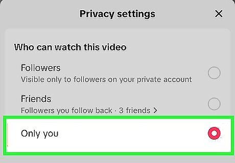 Limit who can see your videos. If you don't want to make your whole TikTok account private, you can change the privacy settings for individual videos you post. By default, when you post a video, everyone can see it. You can limit posts to “Friends’ only” so that only people who follow you can see the video, or “Only me,” which hides your video from everyone except you. When you post a video, you can tap “Everyone can view this post” and change the privacy settings. Alternatively, you can use the following steps to change the privacy settings for videos you’ve already posted: Open the TikTok app and tap Profile in the lower-right corner. Tap a video you want to change the privacy settings for. Tap the icon with three dots (⋮) to the right. Tap Privacy Settings at the bottom (you may need to scroll to the right to see it). Tap Friends or Only you. You can also turn off comments or turn off people’s ability to reuse your video (in duets, stitches, stickers, etc.)