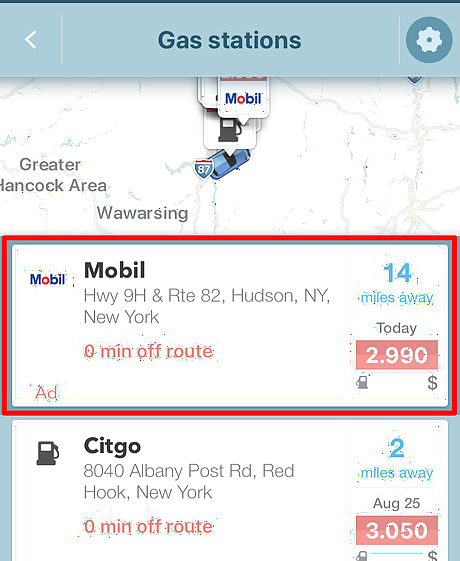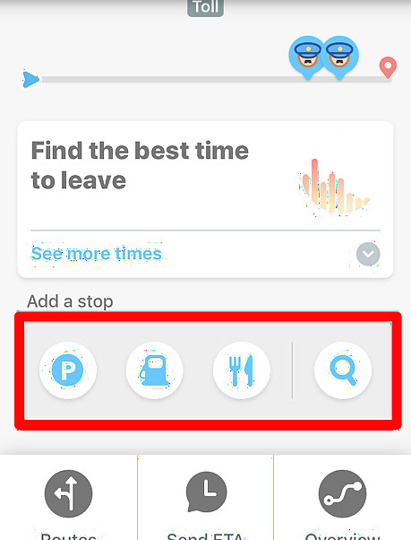 Pick your stop type. Tap either the pin marked "P" icon (designating nearby parking lots/parking spots), or the gas-pump icon (to find nearby gas stations), the fork and knife (designating restaurants and diners) or the magnifying glass (to enter another address). The magnifying glass can give you parking lots, gas stations, restaurants, coffee shops and a whole lot more. To find a location, tap the three dot icon towards the top right of the menu. Alternatively, you can enter an address in the "Add a Stop" box inside the magnifying glass menu. Use the "Favorites" and "History" buttons to find saved or previously searched destinations. Access the "Talk to Waze" button inside the magnifying glass trigger to search by using your voice.