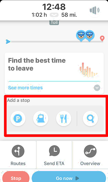 Tap the "Go" button and begin to drive to the location. Once you begin the drive, the route will take you to the stopover point. Once you reach the destination, Waze will change the route so that you can reach your final destination. Only one stopover point is allowed per drive. After you reach the first stopover point, you'll be able to reset the point to something different if need be.