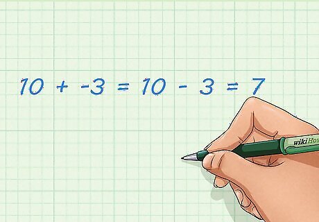 Learn how to add a negative and a positive number. Adding a negative integer is the same as subtracting a positive one. This is easier to see by testing this out with the number line method described in another section, but you can think about it in words too. A negative number is not a normal quantity; it is less than zero, and can represent an amount being taken away. If you add this "taking away" to a normal number, you'll end up making it smaller. Example: 10 + -3 = 10 - 3 = 7 Example: -12 + 18 = 18 + -12 = 18 – 12 = 6. Remember that you can always switch the order of numbers in an addition problem, but not in a subtraction problem.