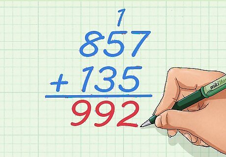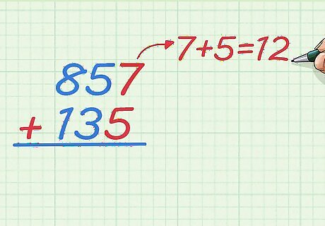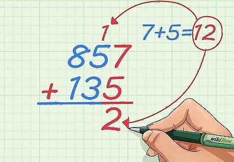 Now begin adding 857+135. You should notice something different as soon as add the first pair of numbers on the right. 7+5 equals 12, a two digit number, but you can only write one digit beneath that column. Keep reading to find out what to do, and why you always need to start on the right instead of the left.