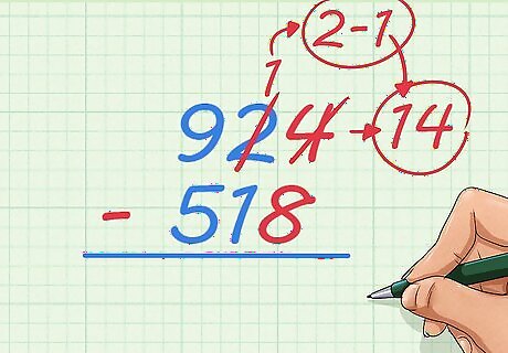 Learn how to solve the first problem, on the far right. This is 4 - 8. This is tricky, since 4 is smaller than 8, but don't use negative numbers. Instead, follow these steps: On the top line, cross out the 2 and write 1 instead. The 2 should be directly to the left of the 4. Cross out the 4 and write 14. Do this in a small space so it's clear the 14 is entirely above the 8. You can also just write a 1 in front of the 4 to make it 14 if you have the room. What you just did is "borrow" a 1 from the tens place, or second column from the right, and turn it into 10 in the ones place, or furthest column to the right. one 10 is the same as ten 1s, so this is still the same problem.