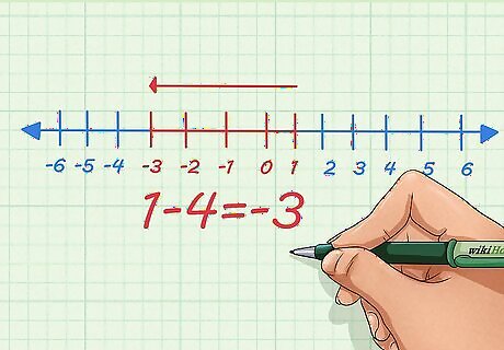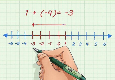 Understand negative numbers. Positive numbers are increases, or movements right on the number line. Negative numbers are decreases, or movements left on the number line. Adding a negative number moves the pointer left on the number line. For example, let's add 1 and -4. In the standard, familiar number writing you're used to, this is just:1 + (-4) On a number line, we start at 1, move 4 spaces left, and end up at -3.