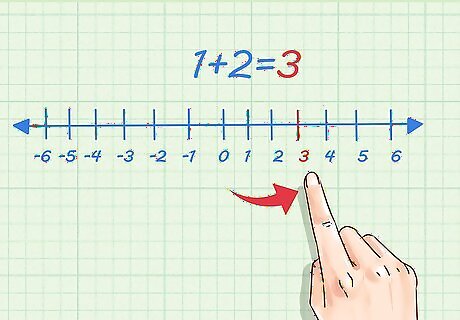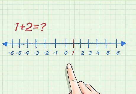 Add 1+2 by moving your finger 2 marks to the right. Slide your finger to the right, counting the number of marks (other numbers) you pass by. Once you've hit 2 new marks, stop. The number your finger is pointing to, 3, is the answer.