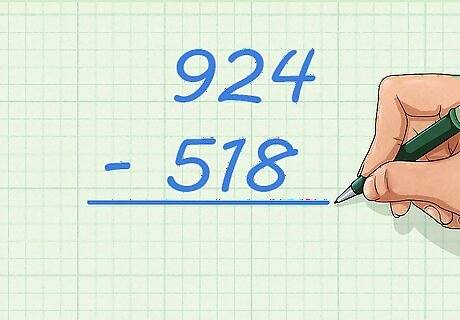 Now write down the problem 924 - 518 in the same way. These numbers are the same length, so you can line them up easily. This problem will teach you something new about subtracting integers, if you didn't know it already.