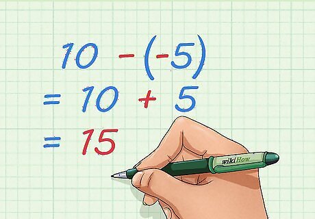 Learn how to subtract a negative integer. Just like the addition problems, you can rewrite these so you only have to deal with positive numbers. If you're subtracting a negative number, you're "taking away" some "stuff taken away", which is the same as adding a positive number. Think of the negative number as stolen money. If you "subtract", or take away, some stolen money so you can return it, that's the same as giving that person money, right? Example: 10 – -5 = 10 + 5 = 15 Example: -1 – -2 = -1 + 2. You already learned how to solve this problem in an early step, remember? Reread Learn how to add a negative and a positive number if you don't remember. Here's the full solution to the last example: -1 – -2 = -1 + 2 = 2 + -1 = 2 – 1 = 1.
