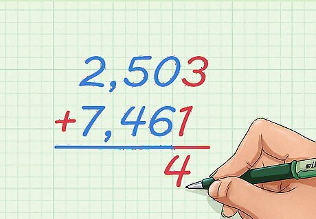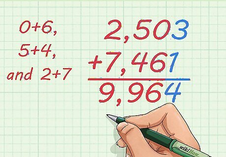 Add each other number the same way. Moving left, you'll add 0+6, 5+4, and 2+7. Write the answers below each pair of numbers. You should end up with the answer to the problem: 9,964. Check your work if you made a mistake.