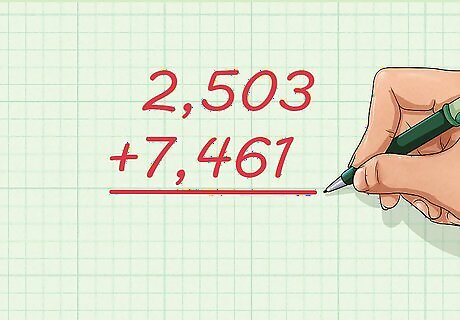 Write the addition problem 2,503 + 7,461 with one number over the other. Line up the numbers so the 2 is above the 7, the 5 is above the 4, and so on. In this method, we'll learn how to add integers that are too large to do in your head or on a number line. Write a + to the left of the bottom number, and a line underneath it, just as you probably learned to do for smaller addition problems.