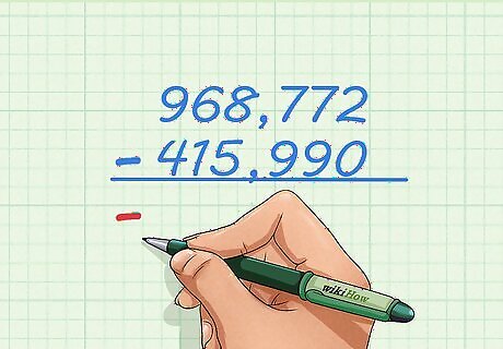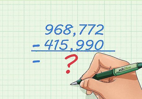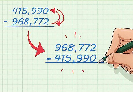 Now begin a problem where you subtract a larger number from a smaller number. Say you're asked to solve 415,990 - 968,772. You write the second number underneath the first, and then realize the number at the bottom is larger! You can tell this immediately by the first digits on the left: 9 is smaller than 4, so the number beginning with 9 has to be larger. Make sure to line the numbers up correctly before comparing them. 912 is not bigger than 5000, which you can tell if you've lined them up correctly, since the 5 is above nothing at all. You can add leading zeros if it helps, for instance writing 912 as 0912 so it lines up well with 5000.