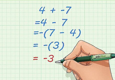 Learn what to do if this turns into a subtraction problem with a smaller number first. Sometimes turning your addition problem into a subtraction problem as described above can end up with odd results like 4 – 7. When this happens, reverse the order of the numbers and make your answer negative. Say you begin with 4 + -7. Turn this into a subtraction problem: 4 - 7 Reverse the order and make it negative: -(7 – 4) = -(3) = -3. If you aren't used to parentheses in your equations yet, think of it like this: 4 - 7 turns into 7 - 4 with a minus sign added. 7 - 4 = 3 but I should make it -3 for the right answer to the problem 4 - 7.