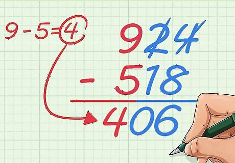Finish the problem by solving the last, left column. 9 - 5=4, so your final answer is 406.