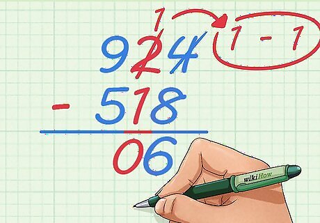 Solve the next column to the left using the new number you wrote down. This should now be 1 - 1, which equals 0. Your answer so far should be 06.