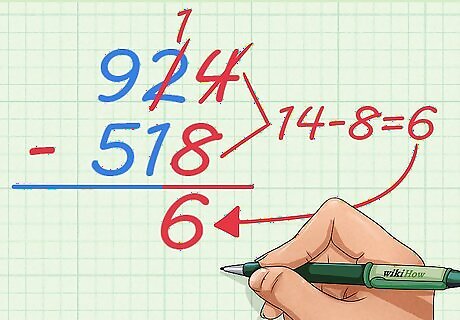 Now solve the problem 14 - 8 and write the answer under the right column. You should now have a 6 on the far right of the line where your answer will be.