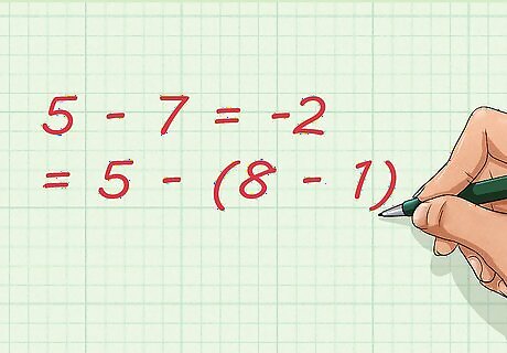 Change minus signs to plus signs when adding negative numbers. Using our step of "change all subtraction to addition", we could write our shorter move now as:5 - (8 - 1) = 5 - 7 = 5 - 8 + 1 . We already know that 5 - 8 = -3, so let's take 5 - 8 out of our equation now and put in -3:5 - (8 - 1) = 5 - 7 = -3 + 1 We already know what 5 - (8 - 1) is — it's going one space less than 5 - 8. Our equation can show the fact that 5 - 8 gives us -3, and going one space short gives us -2. Our equation can be written like this now:-3 - (-1) = -3 + 1