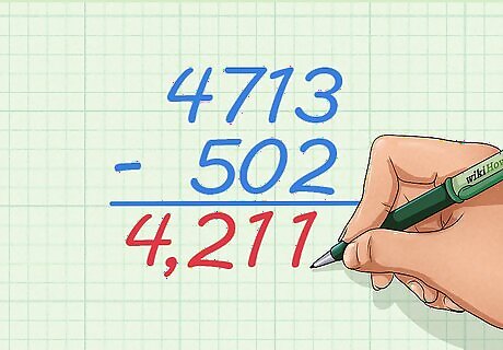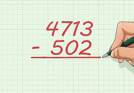 Write the subtraction problem 4713 - 502 with the first number above the other. Write them so the 3 is directly above the 2, the 1 is above the 0, the 7 is above the 5, and the 4 is above a blank space. You can write a 0 underneath the 4 if it helps you keep track of which number is above which other number. You can always add zeros in front of a number without changing it. Make sure to add it in front of the number and not after it.