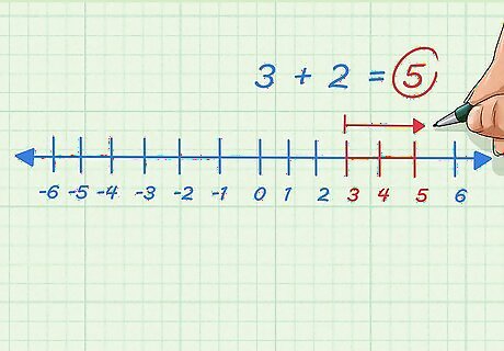 Add any positive integers by moving right on a number line. Suppose we're figuring out what 3 + 2 is. Start at 3, move to the right or increase by 2. We end up at 5. This is written as 3 + 2 = 5.