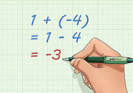 Use a basic equation to understand adding a negative number. Notice that -3, our answer, is the same thing we'd get if we just did 1 - 4. Adding 1 + (-4) and subtracting 4 from 1 are the same. We can write this as an equation, a kind of mathematical sentence showing one things equals another:1 + (-4) = 1 - 4 = -3