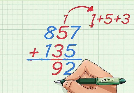 Add 1+5+3 to get the next digit of the answer. You now have three digits to add for this number, since you added a 1 to this column. The answer is 9, so your answer so far should be 92.