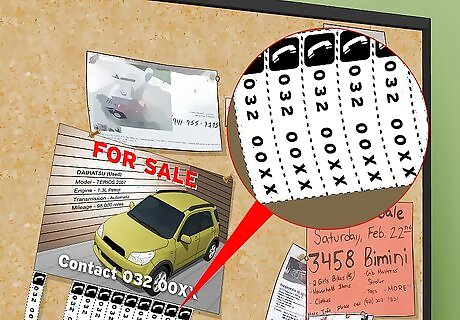 Write "for sale" on your car with window paint. If you already have another vehicle, park your car off to the side of a main road with "for sale" written in big letters on the windshield. Then, on the other windows, write more details about the car, like the asking price, mileage, and year. If you don’t have another car yet, simply write the same information on one or two side windows and continue to drive it around. After you finish the sign, take a good number of steps back and look at it. Make sure that other people could read it from afar.
