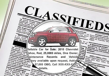 Take out an ad in your newspaper. Most local papers and newsletters contain a section devoted to classified listings. Depending on the circulation of the paper and the size of your ad, this can be a cheap way to find possible buyers. The drawback is that your car may take longer to sell because it’s not as visible as other options. For example, you might write, "Reliable Car for Sale: 2010 Chevrolet Tahoe, Red, 25,0000 miles, One Owner, Maintenance Records and Vehicle History available upon request, Asking Price $7,000 OBO, Call XXX-XXX-XXXX for more details."