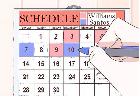 Set up a schedule. As a babysitter, you are likely working for yourself, unless you're a registered childminder, an au pair or a nanny. If you expect to be babysitting a lot, you'll have to make and maintain your own schedule. It may seem old-fashioned but filling out a calendar with all your free days and times, so that when a parent calls to schedule you for babysitting you'll know exactly when you are available is crucial. Creating a color-coding system may be helpful in organizing your ‘busy’ days on the calendar. Update your schedule frequently so that you don’t accidentally double-book yourself. Having a standard schedule with all of your other activities, sports, etc. can also be helpful for parents.