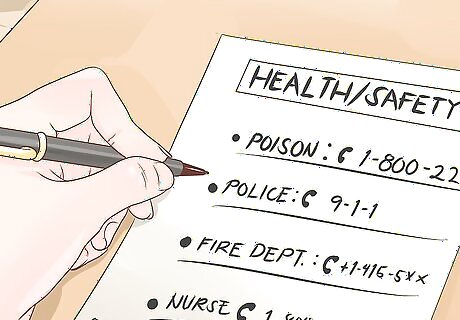 Create a list of health/safety information. You will also need personalized information for each child (such as allergy information), but you should have one generalized list of "worst-case-scenario" phone numbers. Keep all the information in a small notebook, a note-taking app, a binder, etc. so you have it with you at all times. You may want to include: Poison control Police station Fire department Nurse hotline A trusted person who has children (like an aunt or parent) to contact in case of a minor case of confusion Any other relevant numbers Forms for the parents to fill out.