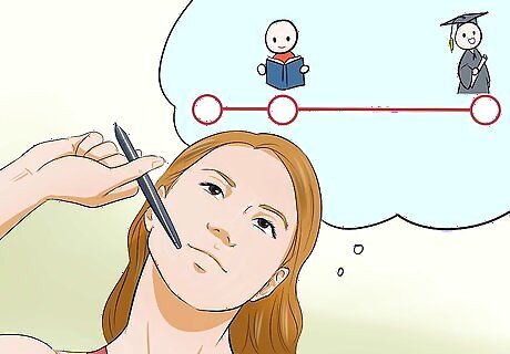 Make short-term and long-term goals. Think about where you want your life to be in five years. This will be important in giving your life a sense of direction, but don’t feel bound to it. As the saying goes, life is what happens when you’re busy making other plans. Therefore, write down where you want to be in a few months, or next year. This should be a smaller, more achievable goal that will make your daily life more enjoyable. Long-term goals involve personal relationships, whether or not to attend college, being in an ideal career or job title, etc. These should be something you strive for, so making a plan is a good idea. However, be aware that your plan will change. For example, marriage may happen when you don’t expect it to, and not happen when you want it to. Be ready to roll with the punches. Short term goals may simply be, for example, that you want to start a weekly exercise regimen by next summer. Or, you may want to simply get a part time job in the next couple months while you explore career options.