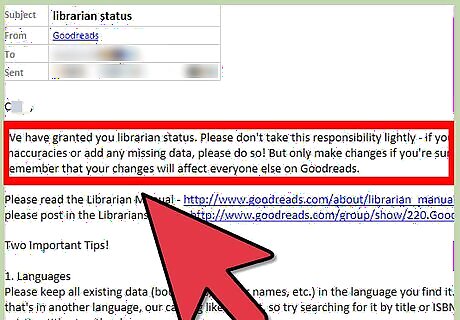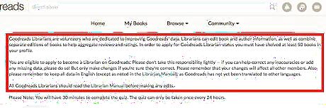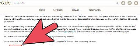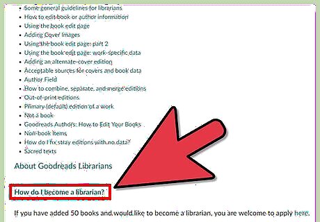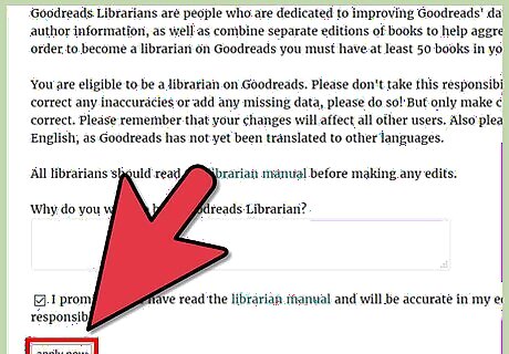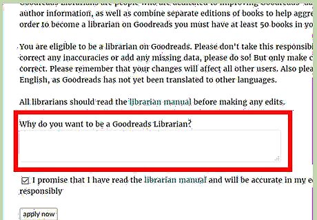 Write why you feel you'd be a great Goodreads Librarian. Enter this into the box underneath the label "Why do you want to be a Goodreads Librarian?" Show Goodreads that you can be trusted with the rights of a librarian; you can say it outright or demonstrate it with the rest of your answers. If you've taken on admin/moderation roles on other sites or in other communities, you might want to mention that, too. Address why you want to do it . Explain that you see inaccuracies in the site and would like to help out with correcting these inaccuracies. For example, you can start out explaining that you'd like to help correct page numbering issues. Give them reason to believe that you take the role seriously and are willing and able to get it right. For example, you might highlight tasks you've done like adding cover pictures from on your own scans (ISBN to ISBN versions) or (for Amazon Kindle/book information. You can use the phrase "I will do the best I can to provide the most accurate data possible" to reinforce the point that you will take the responsibilities seriously. Demonstrate that you understand their policies. For example, explain that you can merge and unmerge items responsibly. If you've commented in the Librarians group, you can highlight that participation; this is a great place for them to understand that you have learned what can be and can not be merged or unmerged. Give them an idea of the status of your shelves. Demonstrate that you understand the workings of the Goodreads site, including how books can be reviewed, shelved to other shelves, and updated.