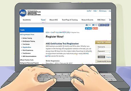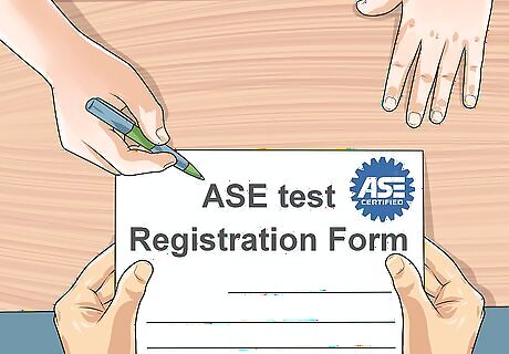 Pay the testing and registrations fees. The cost to register online is $36, with an additional $37 to schedule your exam. These fees are subject to change from year to year, so make sure to refer to the ASE website to find the most up to date costs associated with the examination.. If you are planning on taking additional, more specialized, ASE certification exams, each one will have another fee associated with it. No matter how many certifications you take, the exam fees max out at $111.
