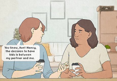 Avoid touchy subjects. One of the trickiest things about family members is that they often ignore boundaries. Your relatives might have an annoying habit of asking deeply personal questions and offering unwanted advice. Try to steer the conversation in a more neutral direction. Maybe your mother is constantly asking you when you are going to get married. Avoid any topics that have to do with weddings, honeymoons, or anything related. Try not to talk about politics. You might enjoy discussing current events, but if you know it's a hot button topic for your family, avoid saying, "So, who are you all voting for?" Firmly and politely establish your boundaries. You can say, "You know, Aunt Nancy, the decision to have kids is between my partner and me. I would appreciate it if you could respect our privacy."
