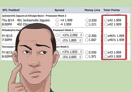 Learn the basics of over/under bets. In this form of betting, it doesn't matter which team wins. Instead, you're trying to predict the total number of points scored by both teams. If the number of points is over a predetermined number, you win money if you place an "over" bet (and vice versa for "under"). For example, let's say that a game between Team A and Team B has an over/under rating of 50. This means that the teams have to score a total of 50 points or more for the "over" bet to win. Otherwise, the "under" bet wins.