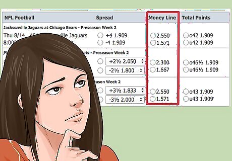 When in doubt, make a straight bet. For football, if a bet isn't otherwise labeled, it is usually offered at odds of 10/11. In other words, if you bet $11 dollars and win, you will make back your money plus $10 for a total of $21. This is called a "straight bet" and is very common in sports betting.