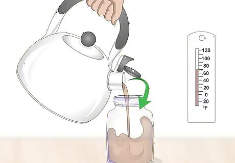 Let the tea cool to room temperature, then pour it into the glass jar. It will probably take a few hours for the tea to completely cool down. The SCOBY is sensitive to high temperatures, so it’s very important that you wait until the tea has cooled before moving on to the next step. You can speed up the cooling process by placing your kettle in an ice bath for around 30 minutes. Make sure the tea is at most 85 °F (29 °C) before adding the SCOBY. If the side of the kettle feels hot to the touch, use a thermometer to check the temperature and make sure it's below 85 °F (29 °C).