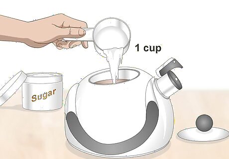 Pour 1 cup (200 grams) of sugar into the tea and stir it until it dissolves. Use a wooden spoon to stir in the sugar as you pour it into the tea. If you’re wary of making your kombucha too sweet, try only adding ½ cup (100 grams) of sugar to the tea. It shouldn’t take more than a few minutes for the sugar to completely dissolve in the tea.